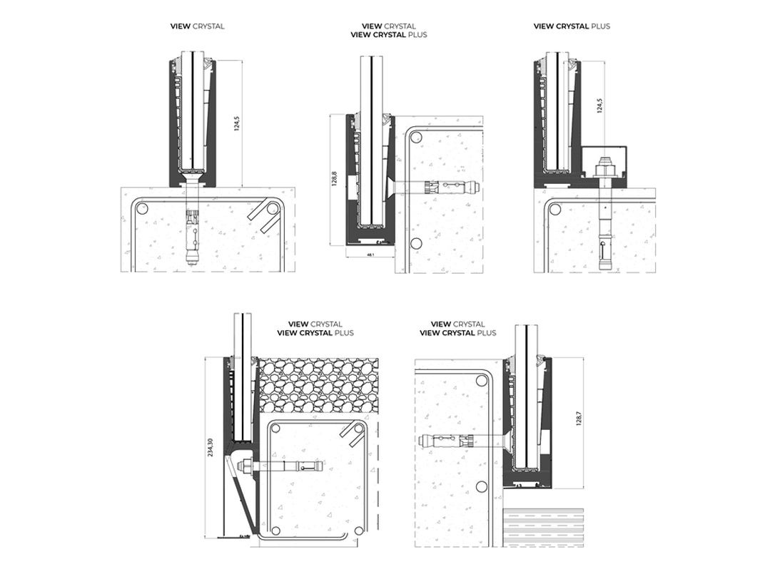 Este sistema de barandilla permite 12 posibilidades de acristalamiento: doble vidrio de 10, 8 o 6 unido por hasta cuatro butirales de polivinilo de 0,38 mm. Se recomienda usar vidrio templado.